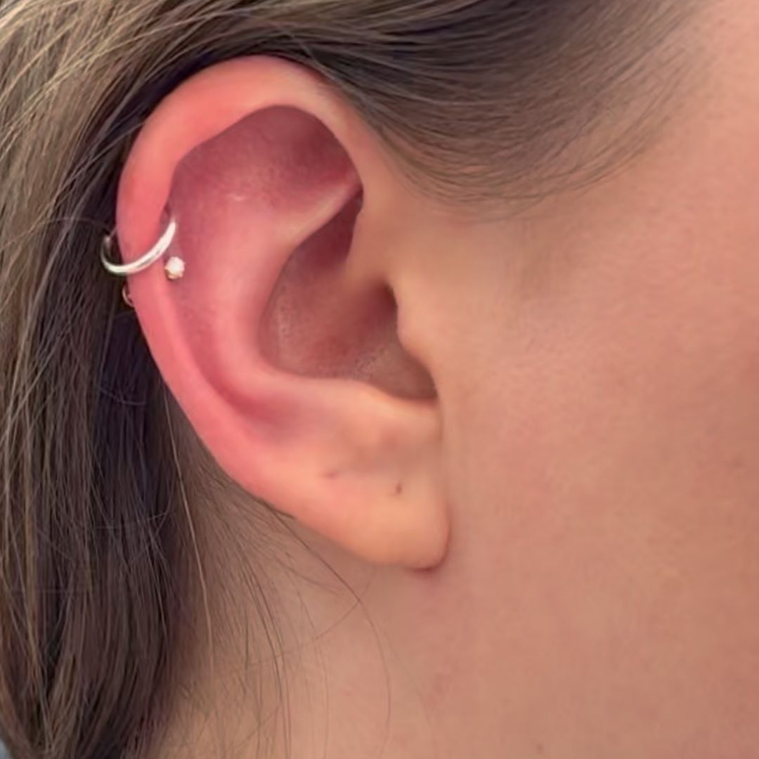 Located on the inner ridge of the upper ear between the forward helix and the lobe, this piercing is very popular among our patients.
